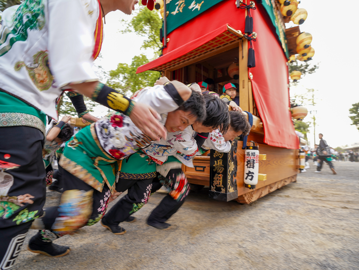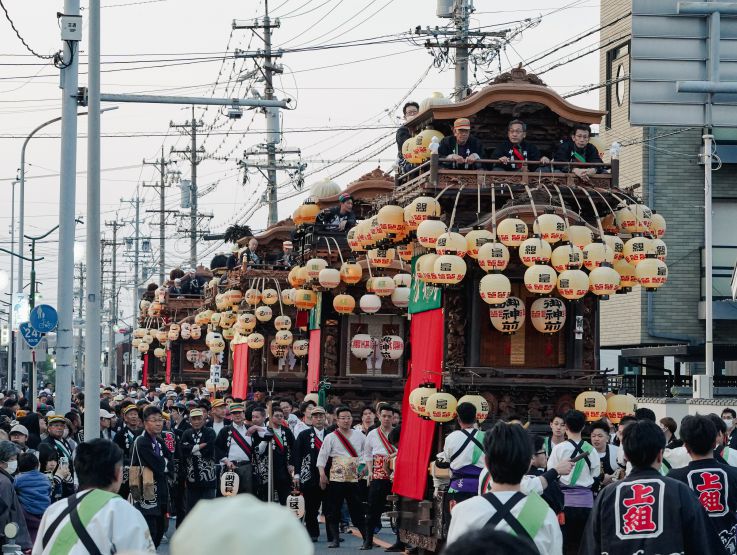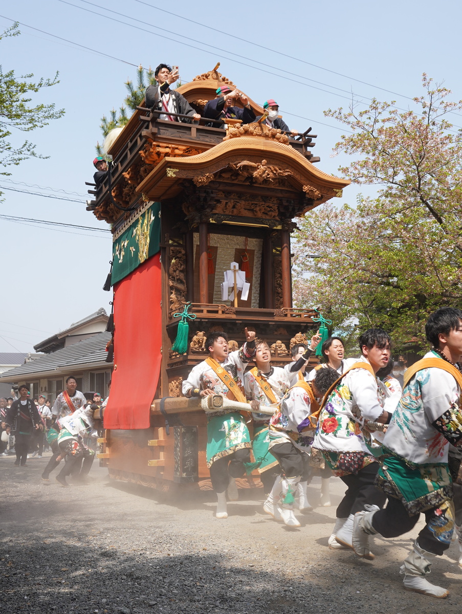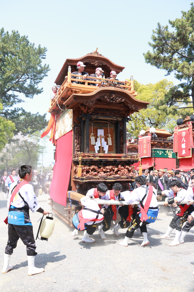 武豊町長尾地区には6輌の山車があり、4月の春祭り「武雄神社例祭」では地区の氏神である武雄神社に6輌の山車が奉納されます。神社境内に6輌の山車が曳き揃えられるのは知多半島で最多、愛知県内でも有数の規模です。広い神社境内で繰り広げられる豪快な山車の曳き込み・曳き出しが祭り最大の見所です。前夜祭では山車に提灯を付けて武雄神社からJR武豊駅まで揃って巡行します。本祭ではからくり人形や子供三番叟・巫女舞の奉納も行われます。