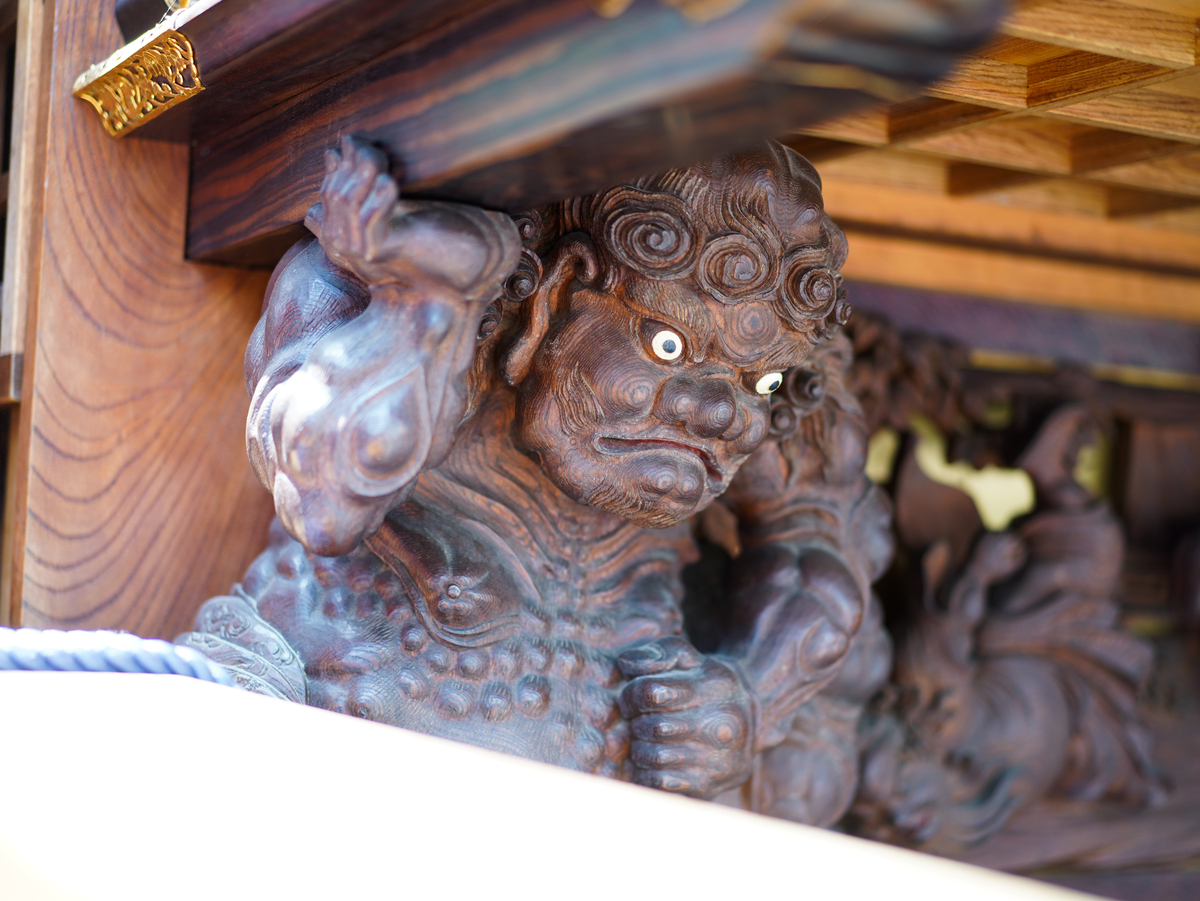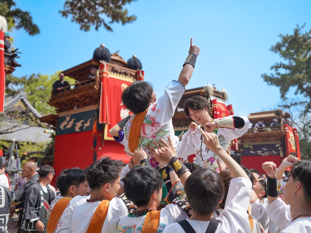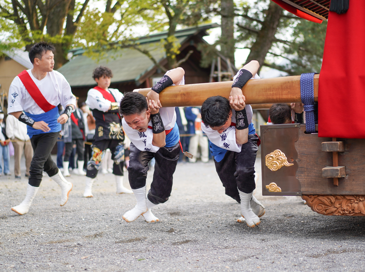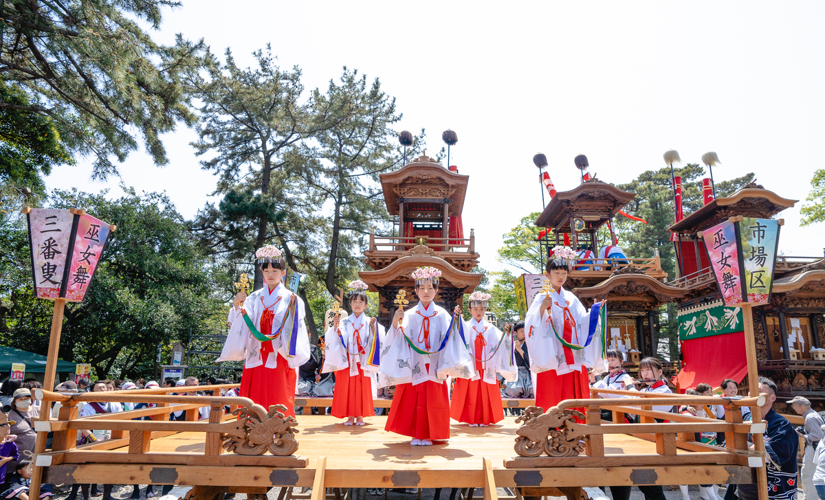 武豊町長尾地区には6輌の山車があり、4月の春祭り「武雄神社例祭」では地区の氏神である武雄神社に6輌の山車が奉納されます。神社境内に6輌の山車が曳き揃えられるのは知多半島で最多、愛知県内でも有数の規模です。広い神社境内で繰り広げられる豪快な山車の曳き込み・曳き出しが祭り最大の見所です。前夜祭では山車に提灯を付けて武雄神社からJR武豊駅まで揃って巡行します。本祭ではからくり人形や子供三番叟・巫女舞の奉納も行われます。