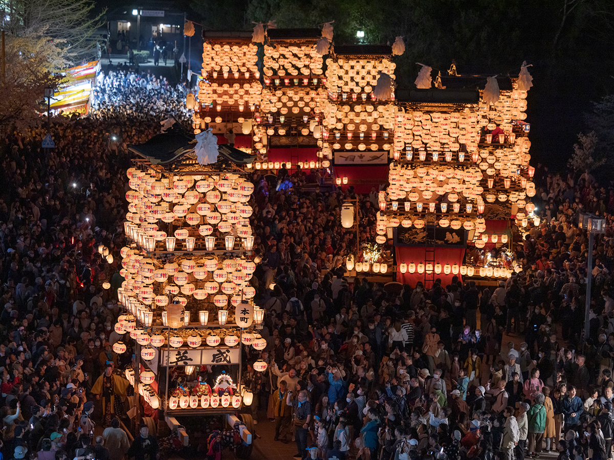 夜になると各車山に提灯のあかりを灯した夜車山(よやま)が曳き回され、幻想的な雰囲気を演出します。