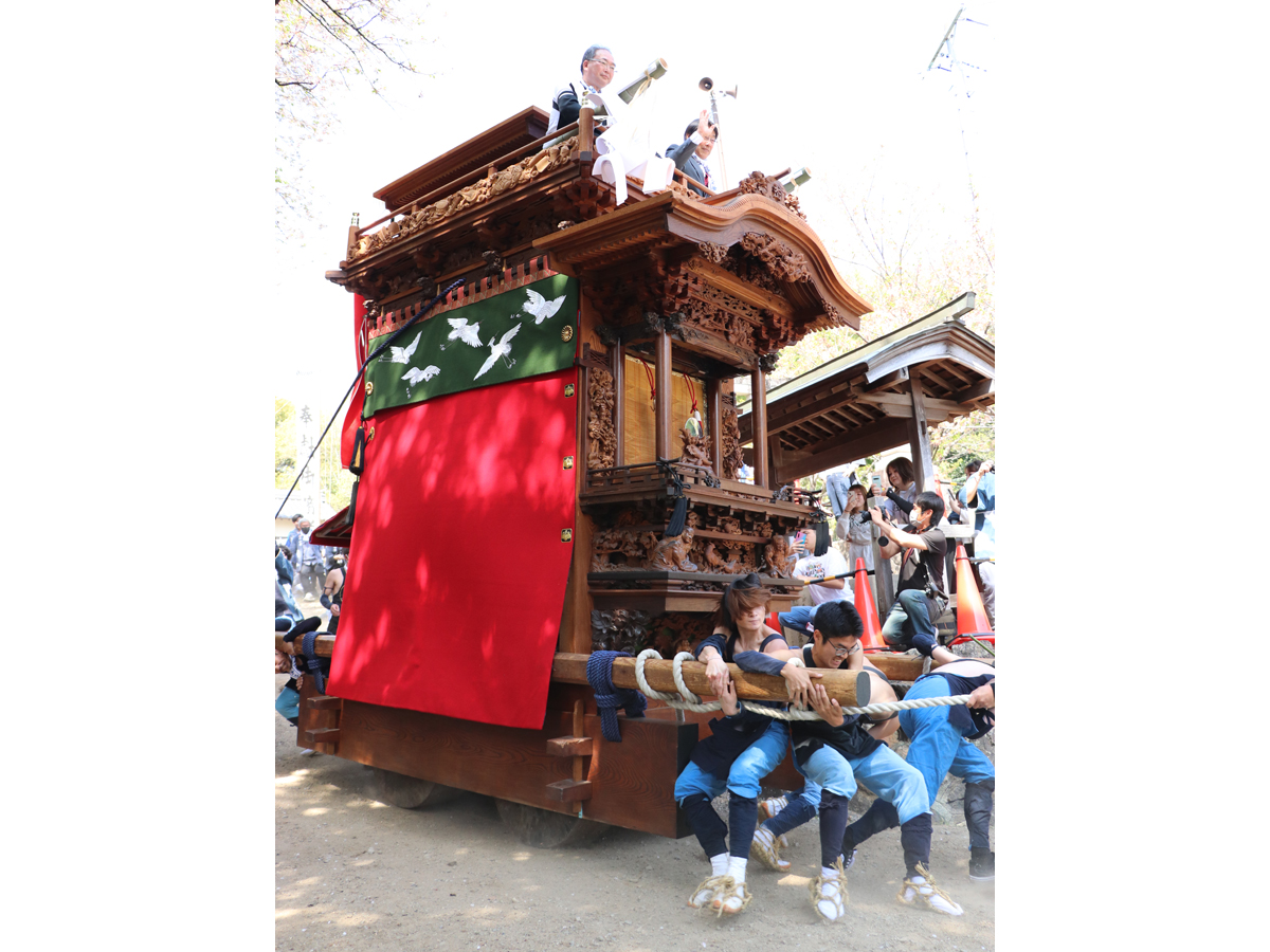 阿久比の春まつりでは、五穀豊穣を願い、精緻な彫刻や、きらびやかな刺繍が施された色とりどりの幕で飾られた豪華絢爛な山車「大山車」が、4月の間、町内の各地区で引き回され、お囃子奉納などが行われます。