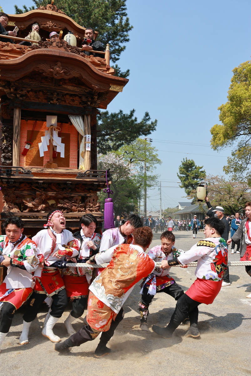 武豊町長尾地区には6輌の山車があり、4月の春祭り「武雄神社例祭」では地区の氏神である武雄神社に6輌の山車が奉納されます。神社境内に6輌の山車が曳き揃えられるのは知多半島で最多、愛知県内でも有数の規模です。広い神社境内で繰り広げられる豪快な山車の曳き込み・曳き出しが祭り最大の見所です。前夜祭では山車に提灯を付けて武雄神社からJR武豊駅まで揃って巡行します。本祭ではからくり人形や子供三番叟・巫女舞の奉納も行われます。