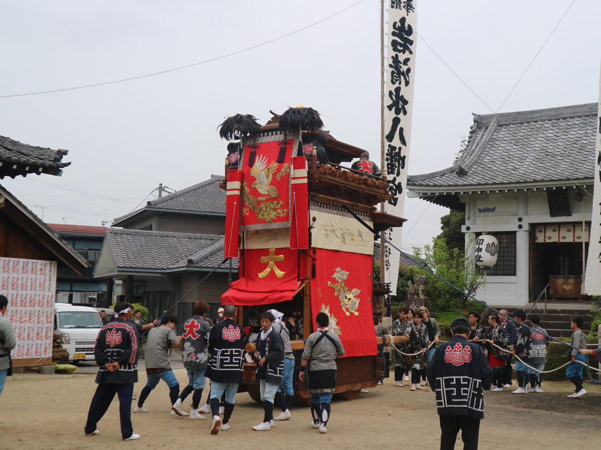 阿久比の春まつりでは、五穀豊穣を願い、精緻な彫刻や、きらびやかな刺繍が施された色とりどりの幕で飾られた豪華絢爛な山車「八幡社山車」が、4月の間、町内の各地区で引き回され、お囃子奉納などが行われます。