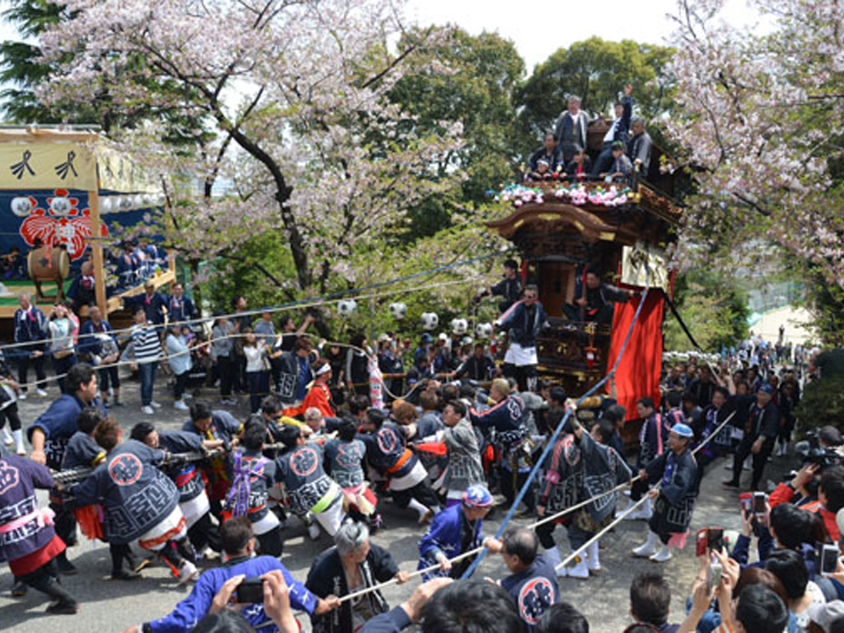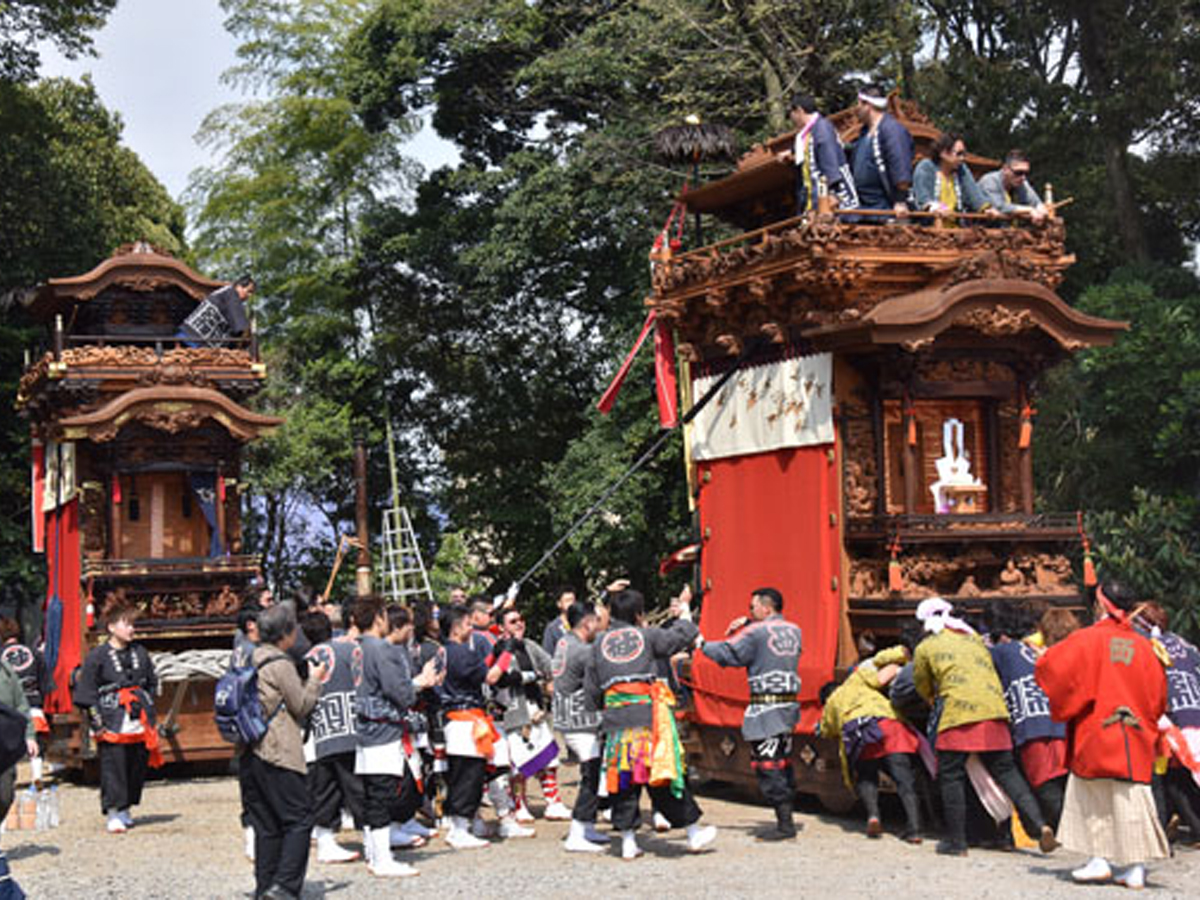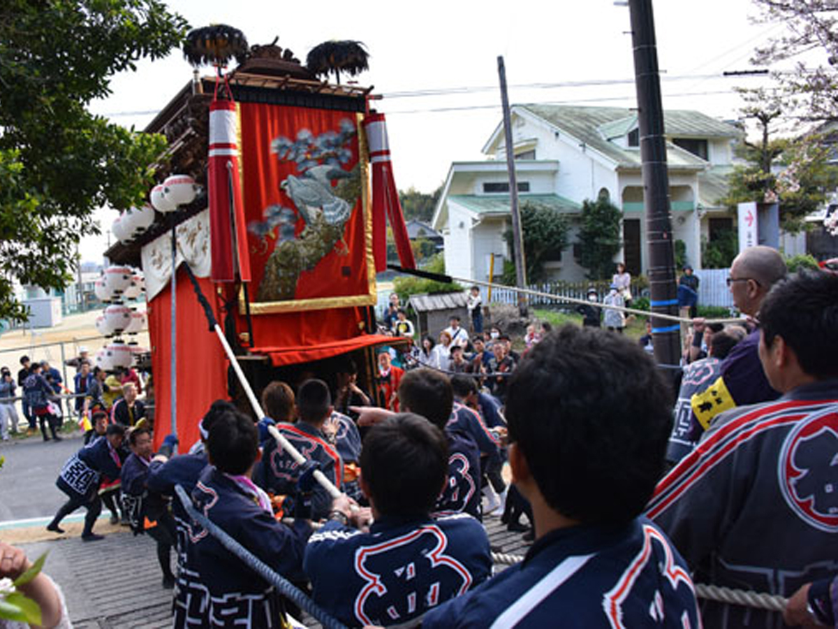 山車の坂上げ、神子の舞、三番叟(前棚人形)、巫女の舞(浦安の舞)の奉納後、餅投げが行われ、神社境内は多くに人で賑わいます。